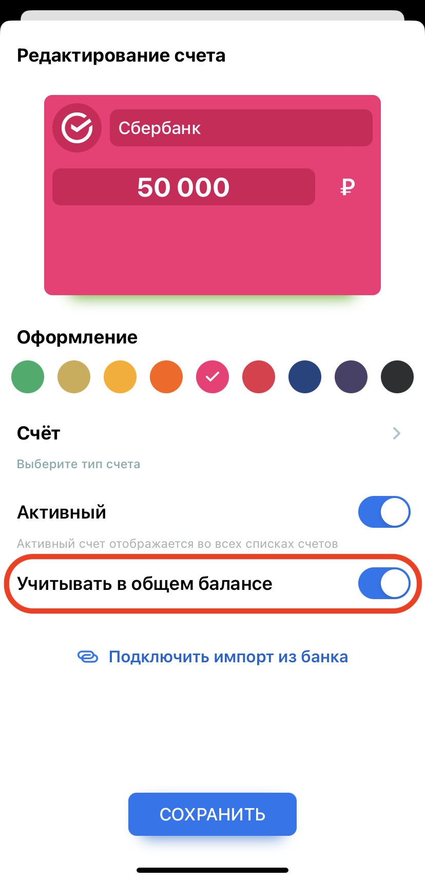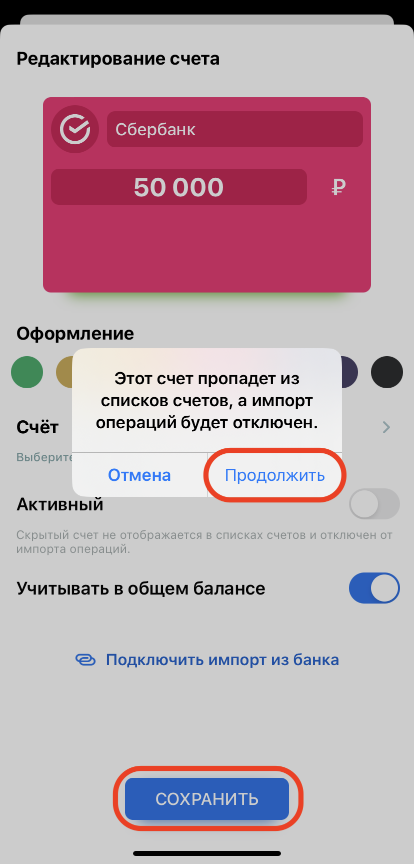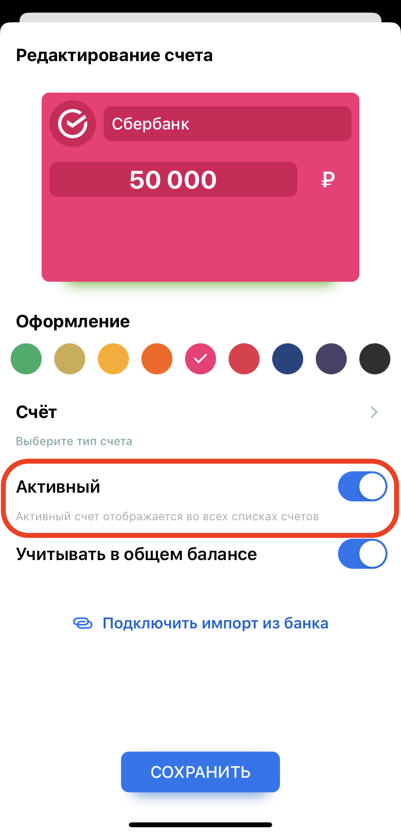 На основном экране счета будут отображаться в том порядке, в каком они расположены в списке счетов.