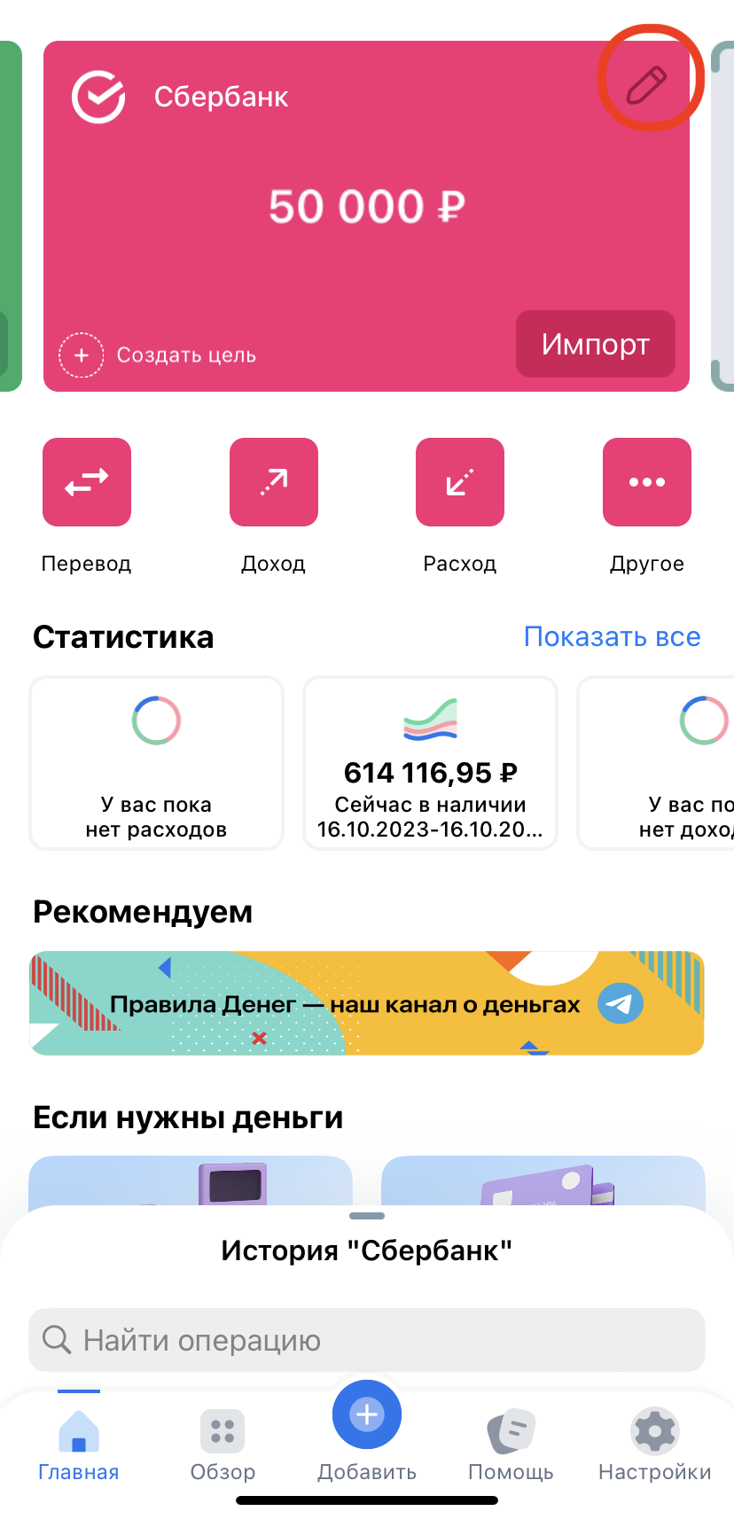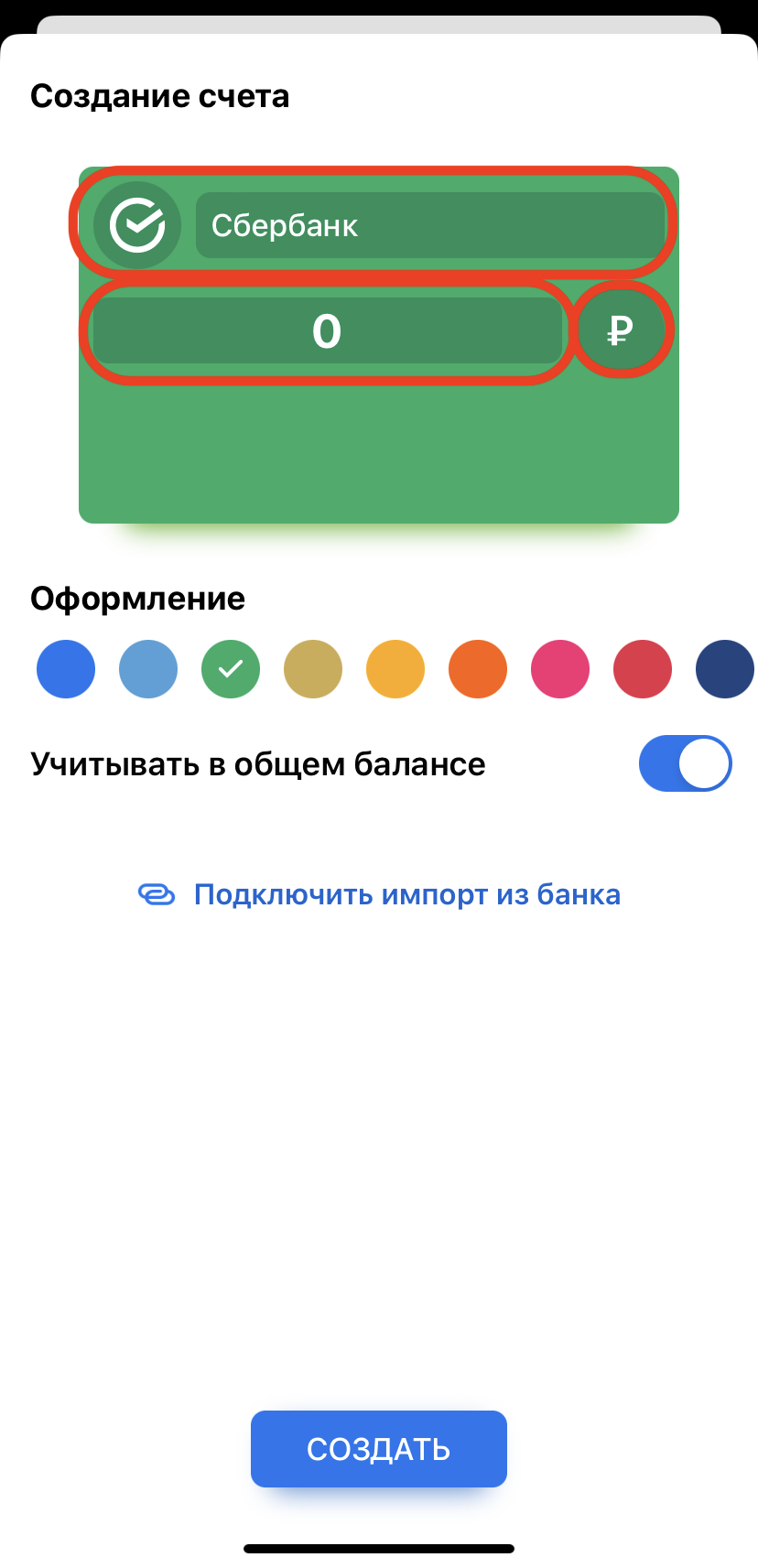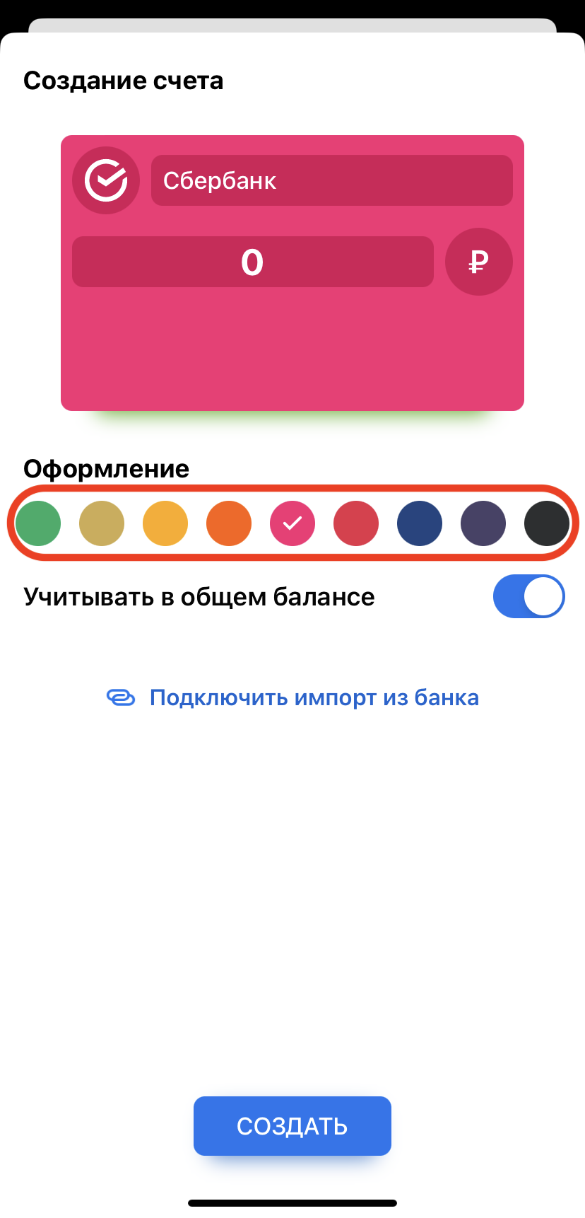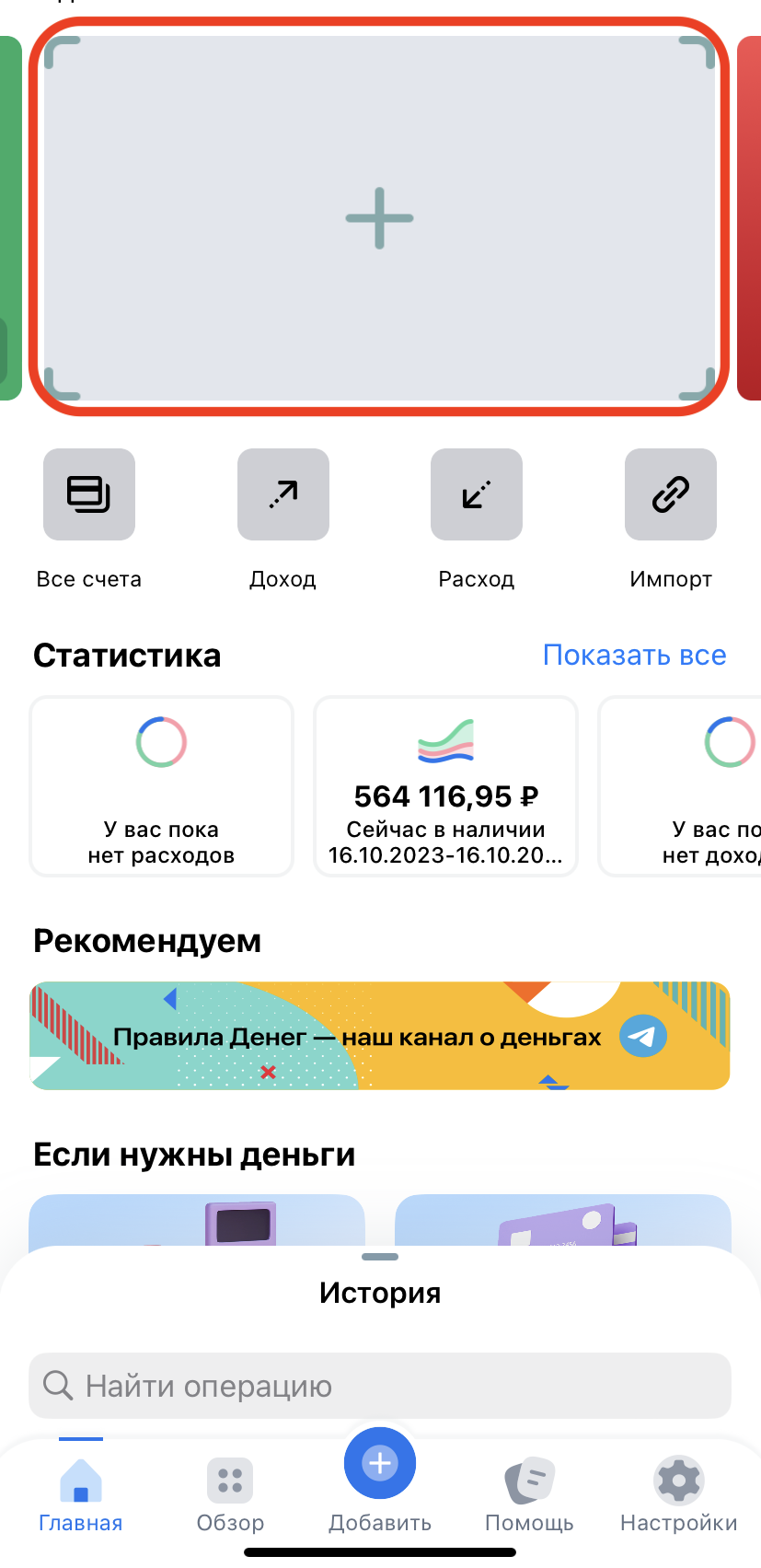 Если нажать коротким тапом на карточку баланса на основной панели приложения, то откроется поле счетов (список всех счетов).