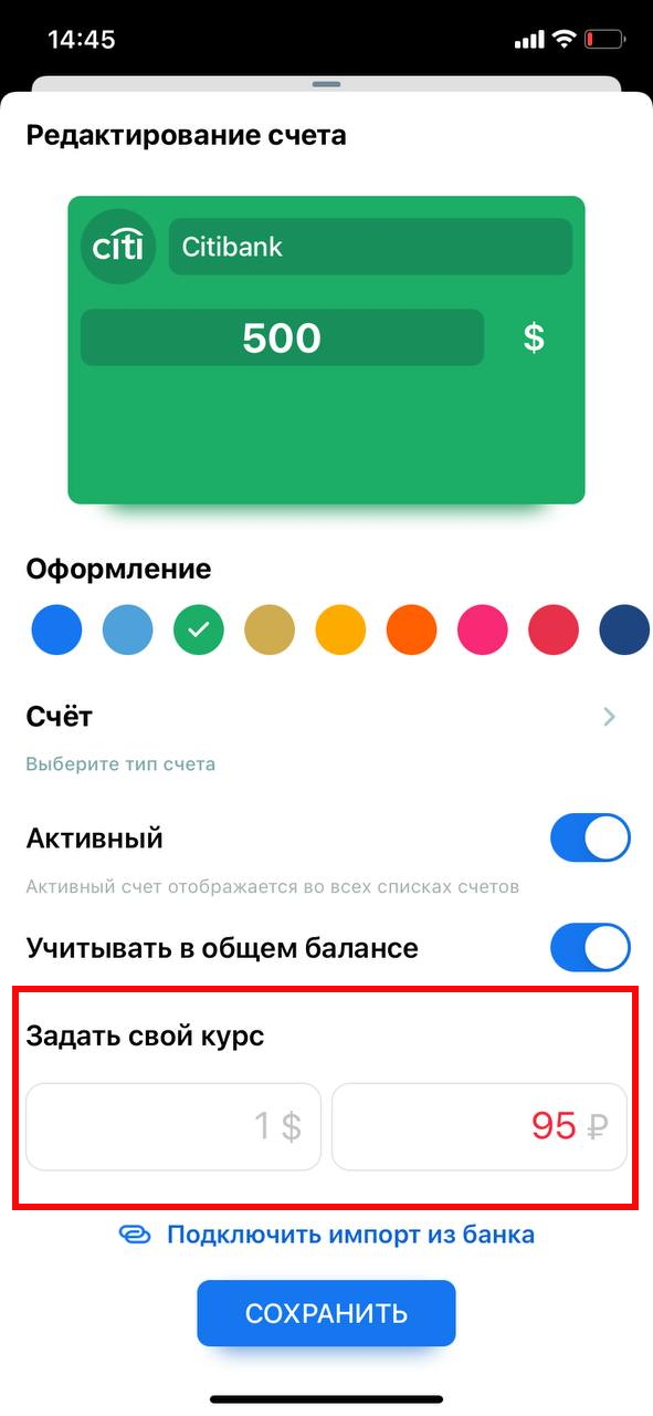 Чтобы задать свой курс валюты, откройте экран редактирования счета (тап на карандаш на счете).