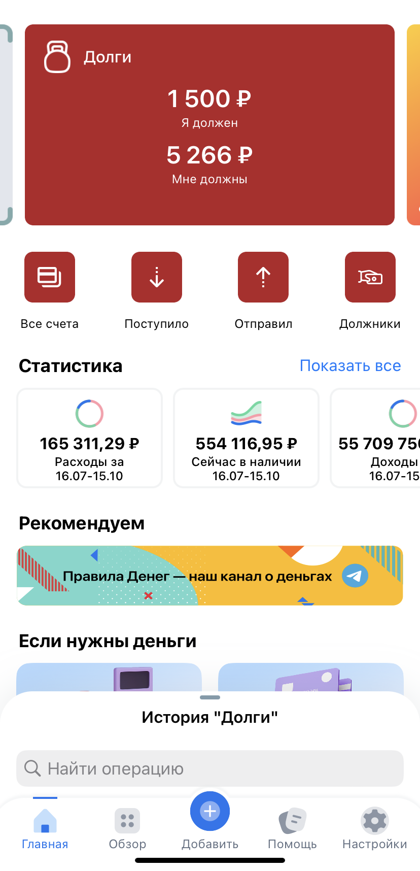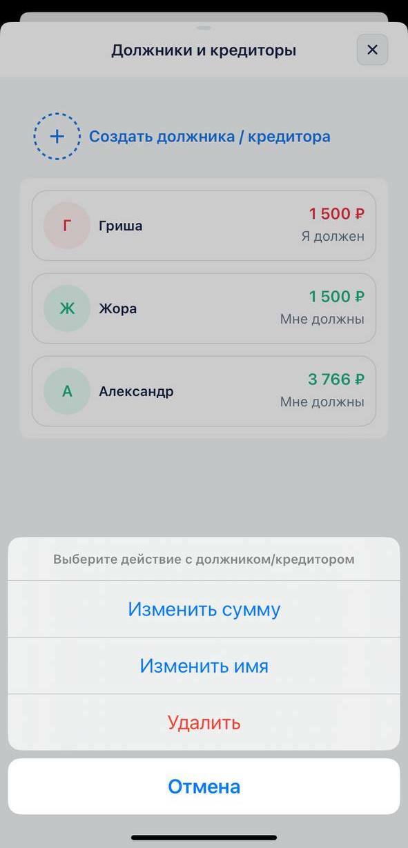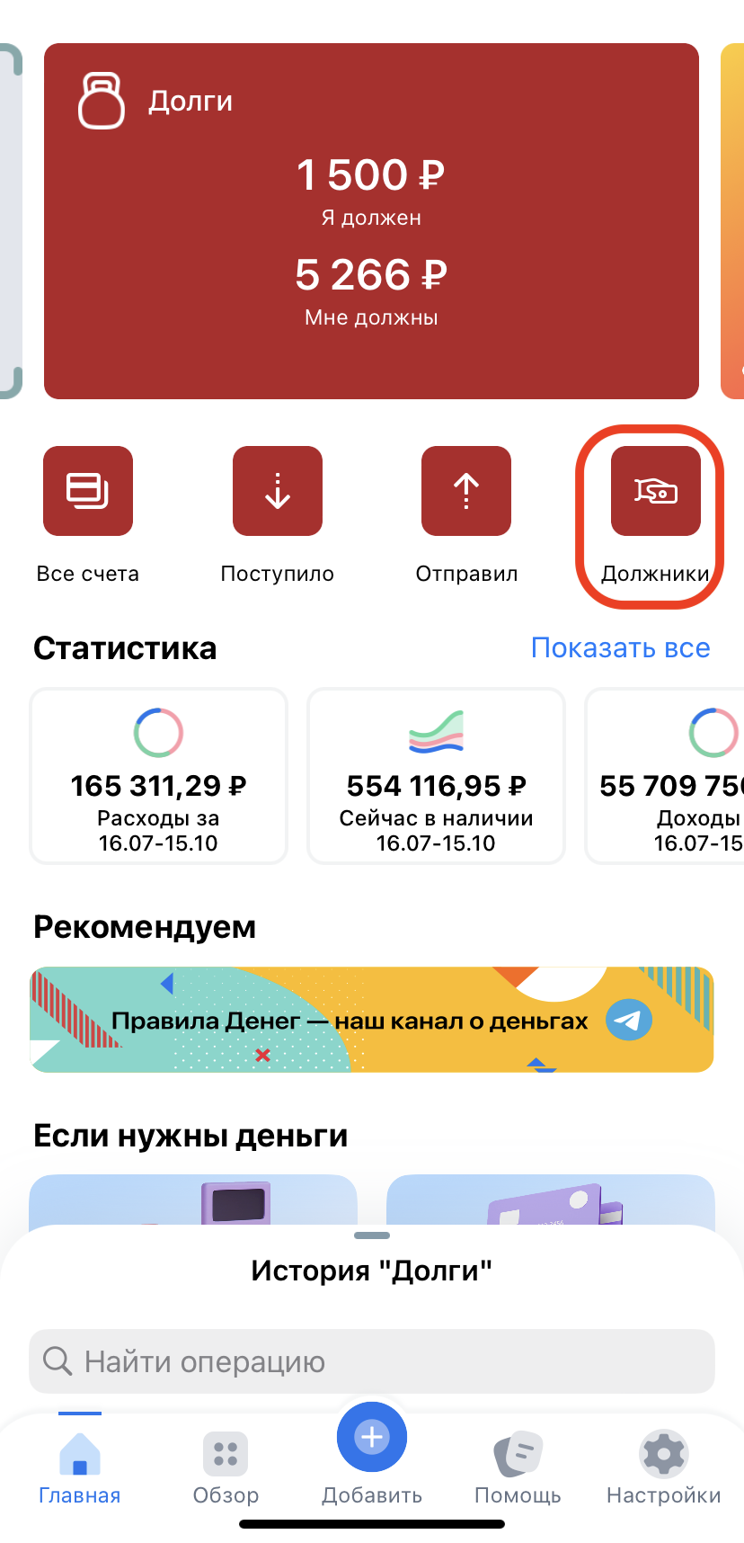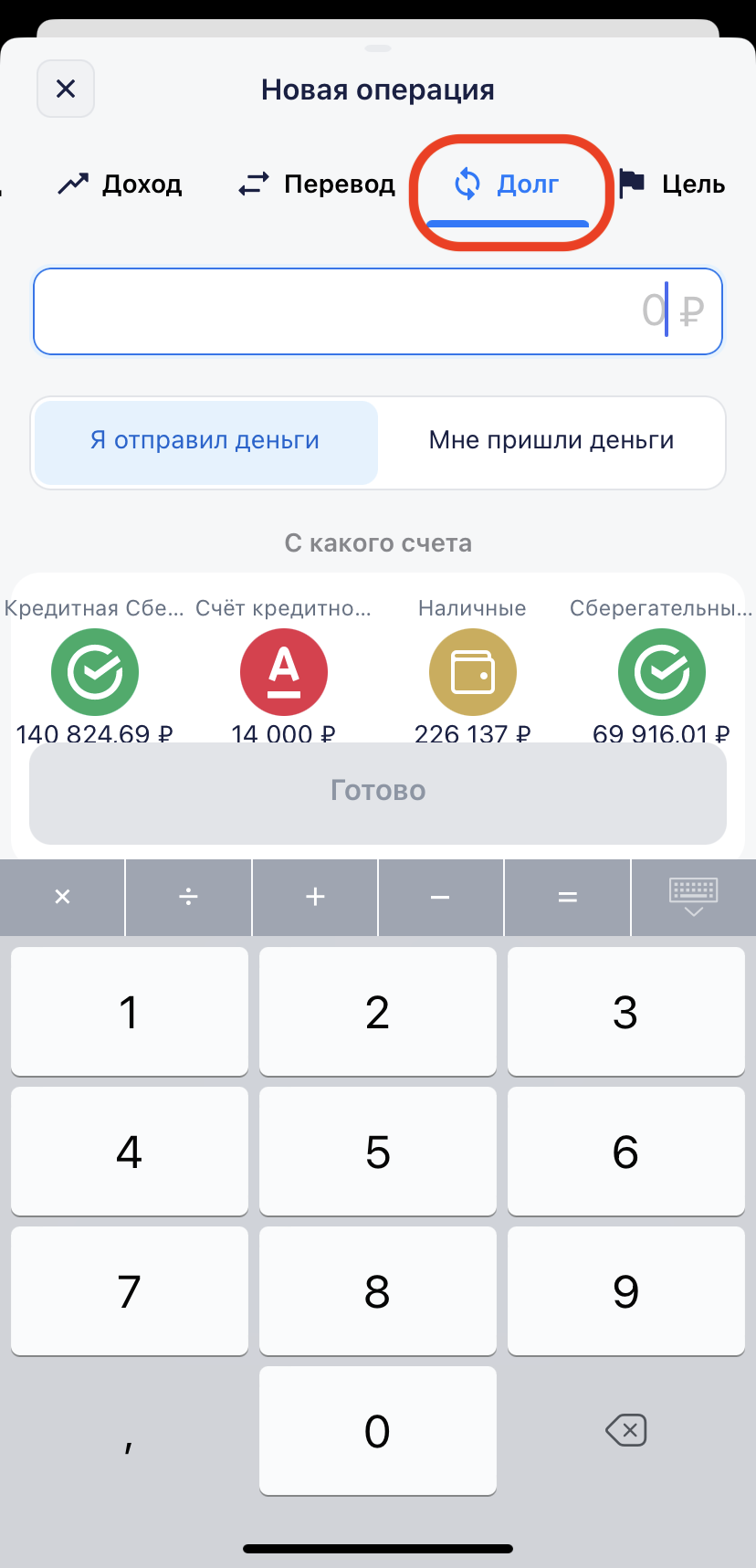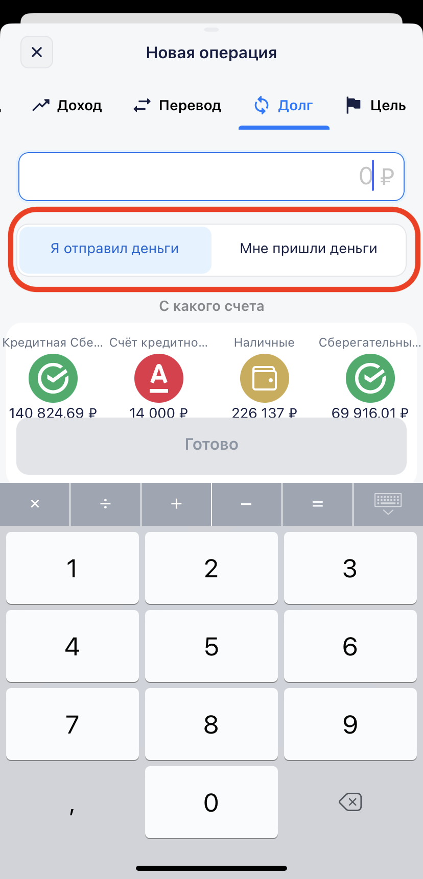 На экране "Долг" доступны клавиши "Все счета", через которую можно вернуться обратно, "Поступило", через которую можно отметить, сколько средств вернули в рамках долга или дали в долг пользователю, "Отправил", через которую можно внести сумму, которую дал в долг пользователь, "Должники", где можно добавить должника/кредитора или отредактировать профиль уже существующего.