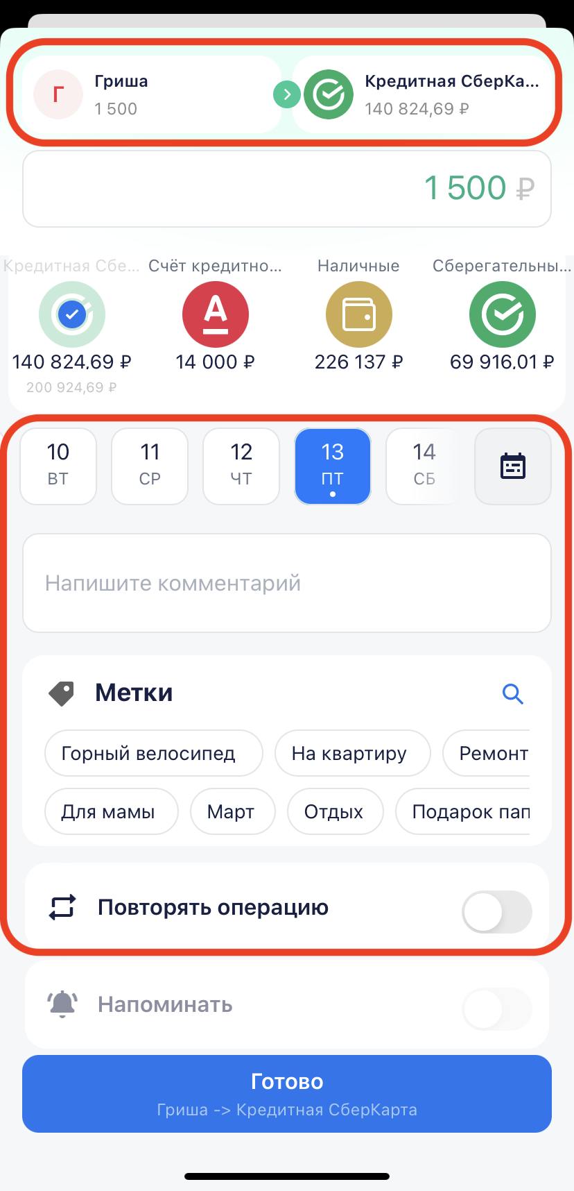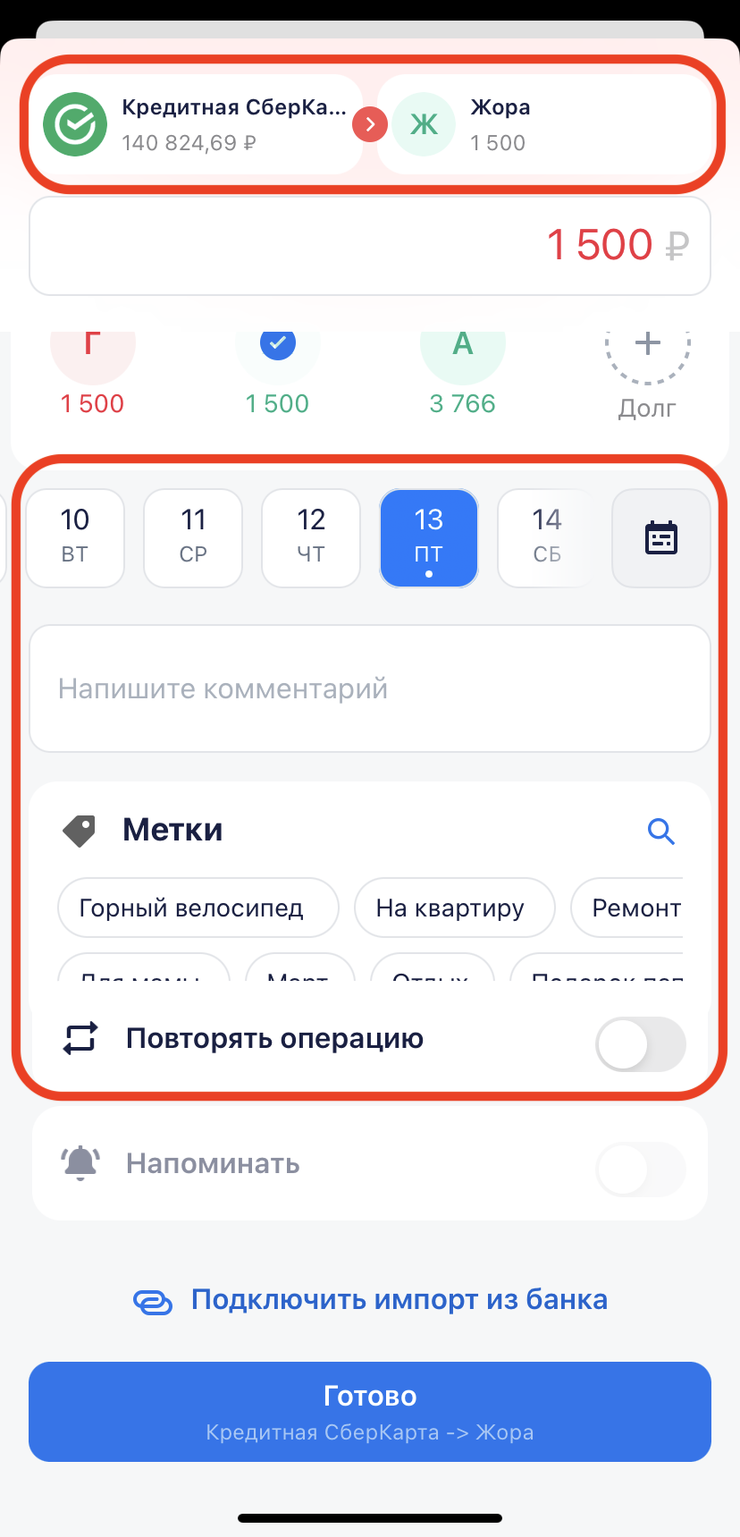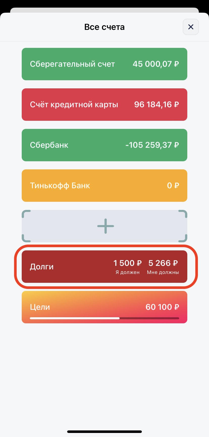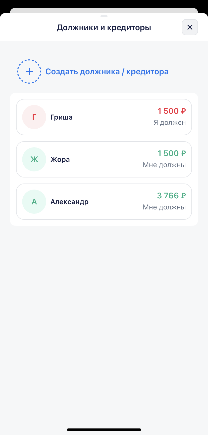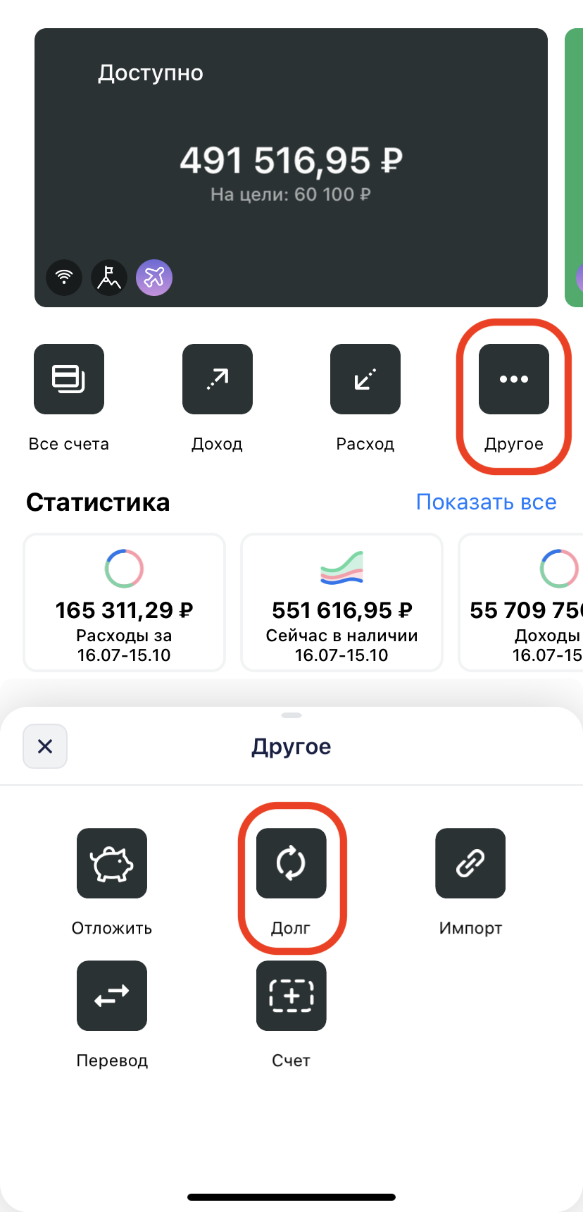 На экране "Долг" доступны клавиши "Все счета", через которую можно вернуться обратно, "Поступило", через которую можно отметить, сколько средств вернули в рамках долга или дали в долг пользователю, "Отправил", через которую можно внести сумму, которую дал в долг пользователь, "Должники", где можно добавить должника/кредитора или отредактировать профиль уже существующего.