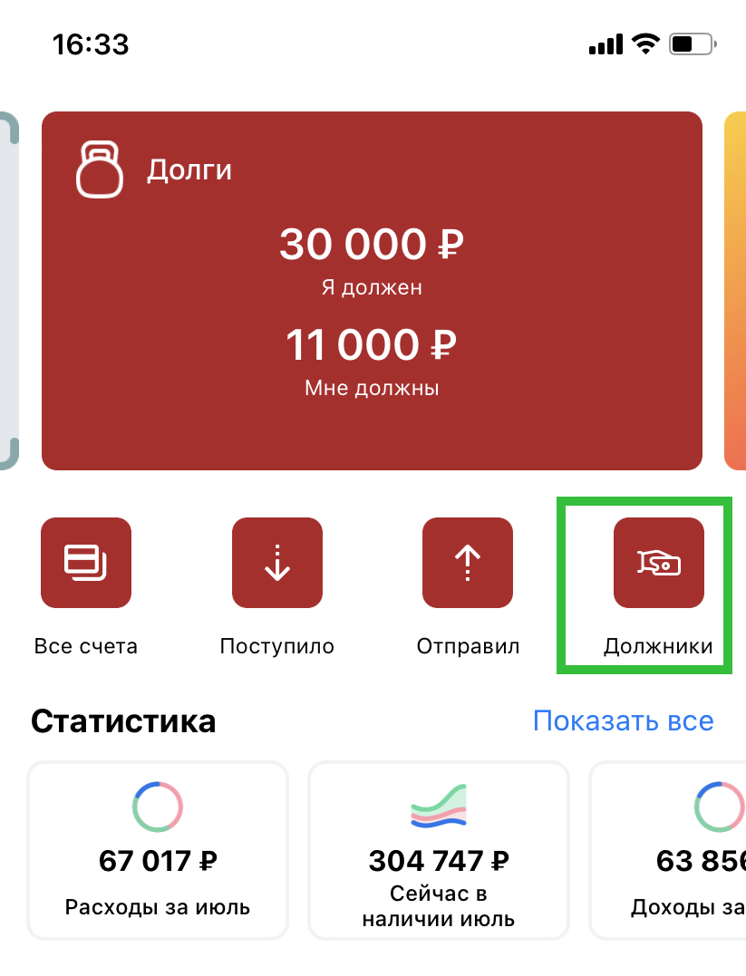 На карточке "Долги" 2 суммы: сколько вы взяли в долг и сколько вам должны вернуть. В разделе "Должники" - список всех Ваших должников и кредиторов. Теперь можно отредактировать сумму должника (например, если вы решили простить долг) или удалить его вовсе.