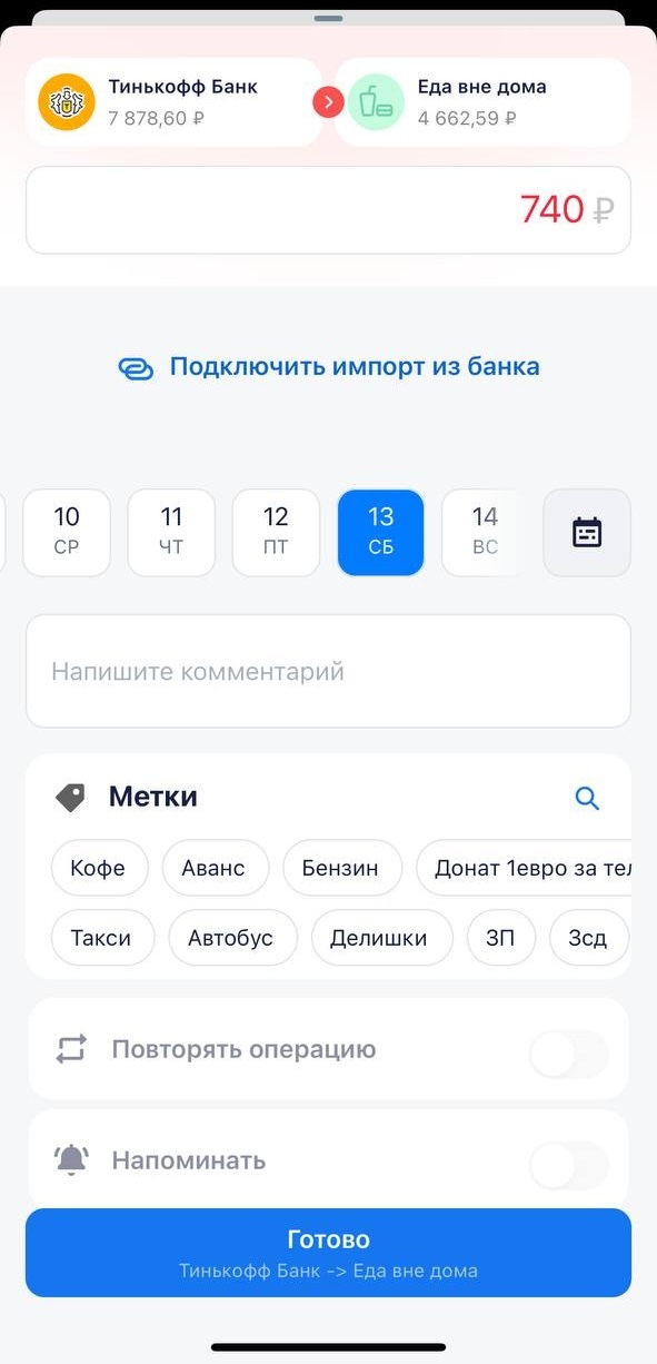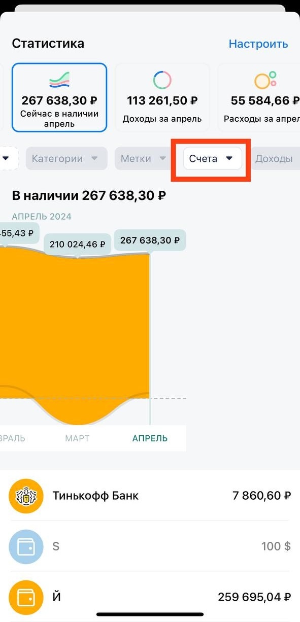 На графике показываются первые 5 счетов в том порядке, как они расположены в списке счетов. Цвет суммы на карточке счета совпадает с цветом карточки счета.