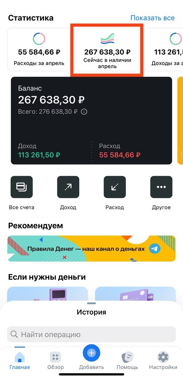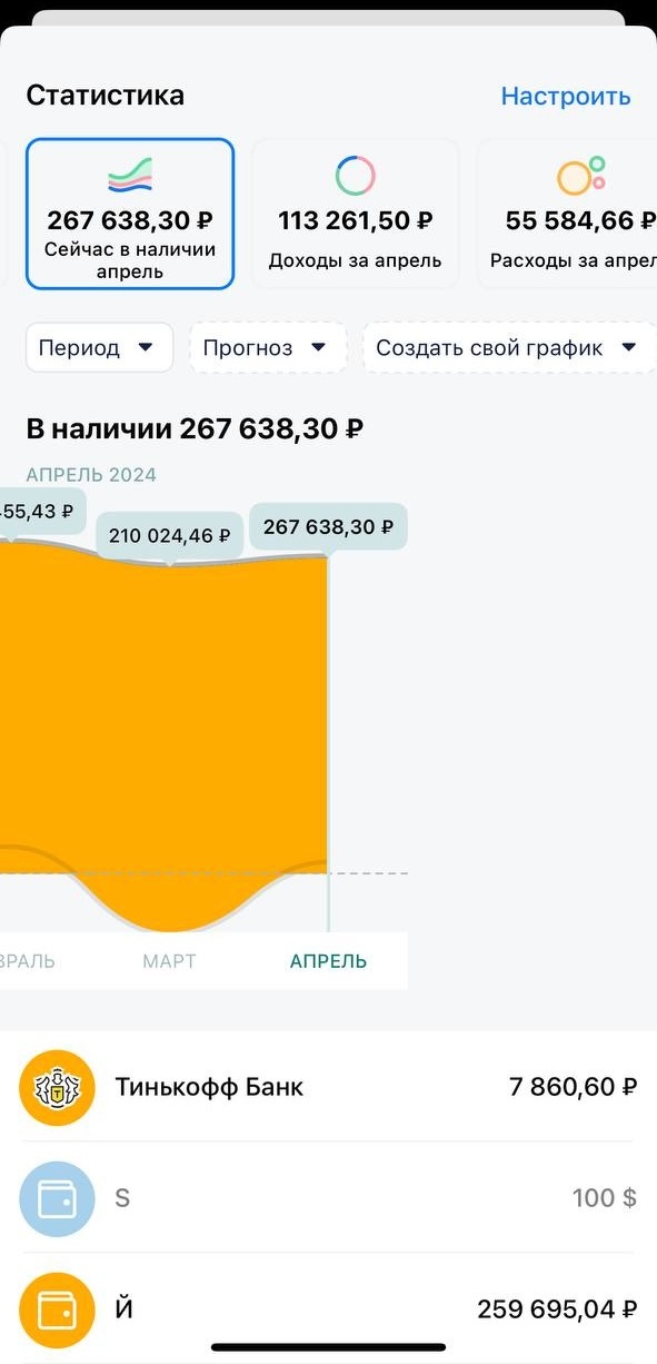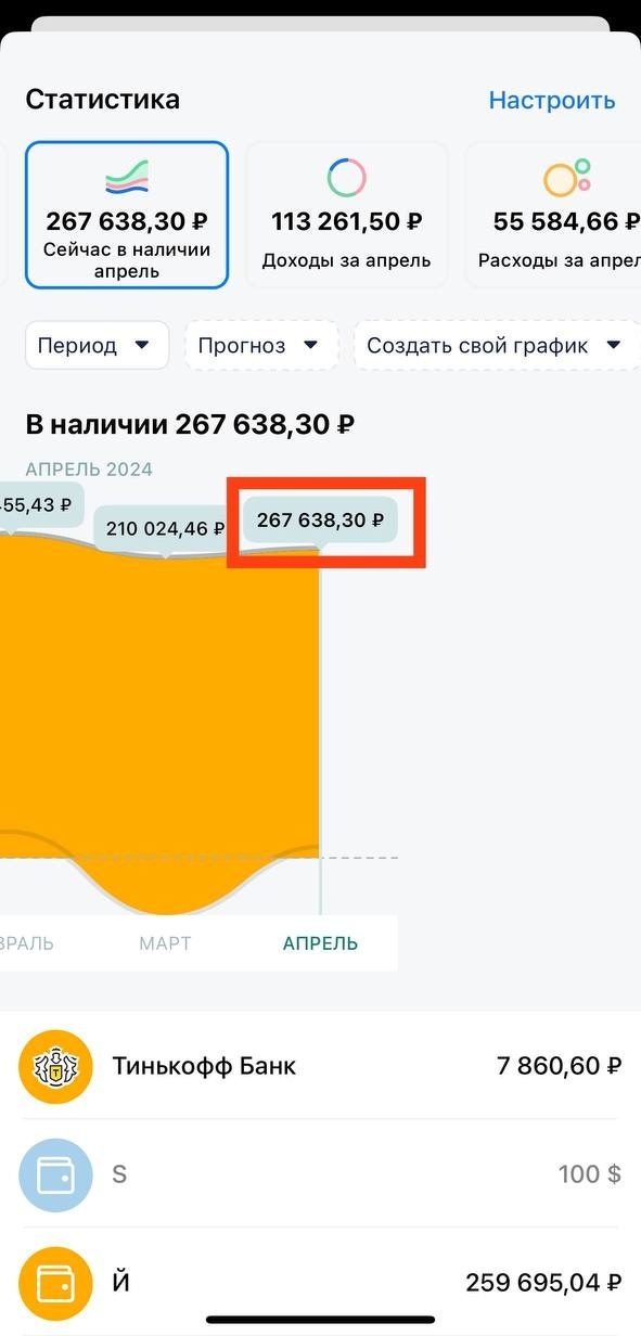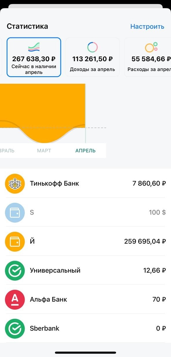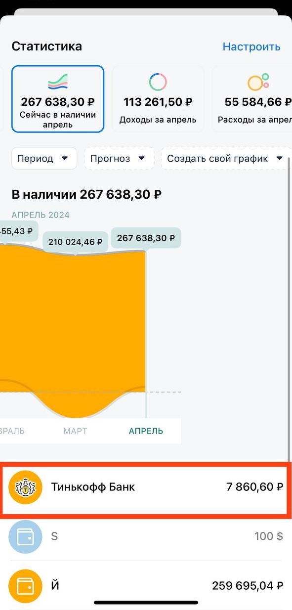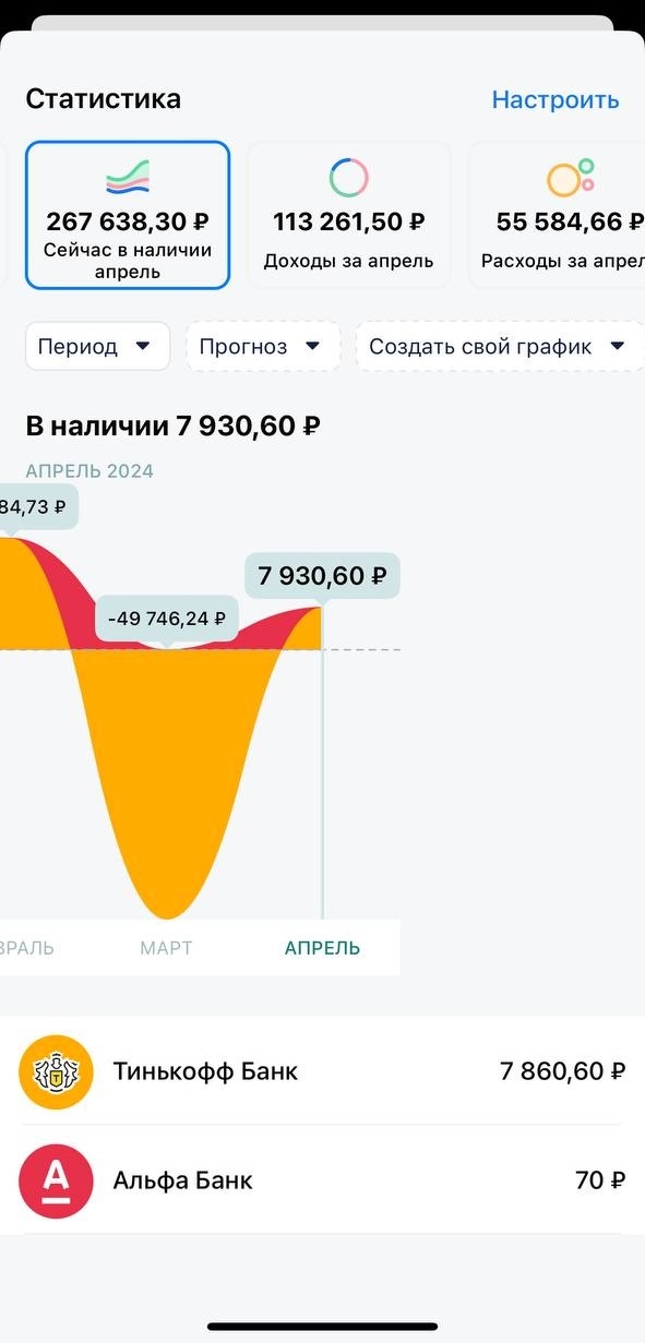 График показывает наличие денег на счетах, в том числе отрицательных (ниже оси У), но без счетов, исключенных из общего баланса.