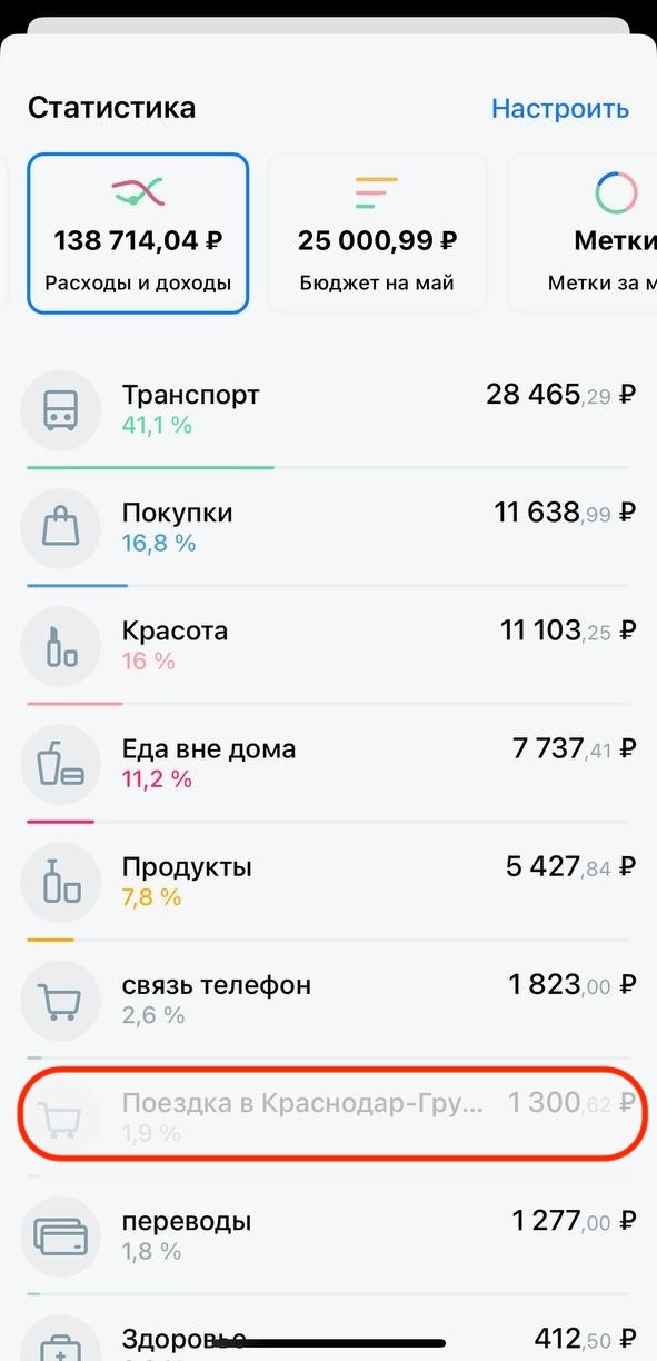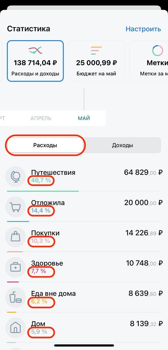 Порядок расположения категорий расходов в списке - от большего к меньшему - по сумме расходов по категории (с процентами от общей суммы). Порядок расположения доходов - по величине суммы дохода, от большего к меньшему (с процентами от общей суммы).