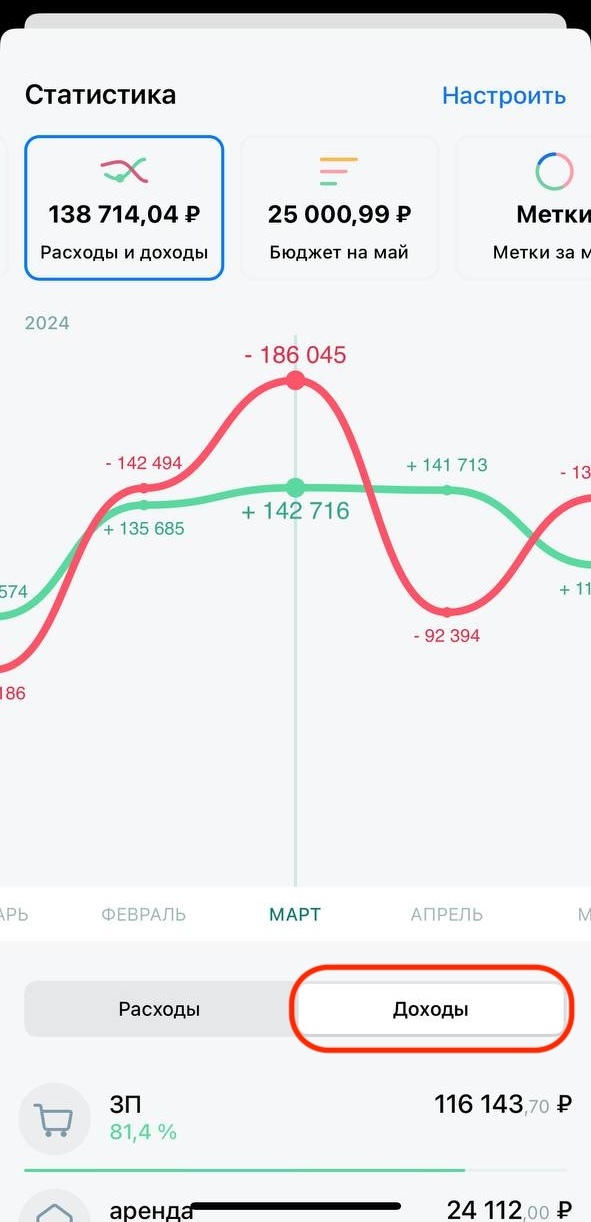 График Расходы и Доходы расположен в блоке статистики на основной панели приложения. При необходимости его можно переместить (Настроить аналитику) в другое место экрана или скрыть. На графике отображаются 2 линии - расходов и доходов в соответствии с отчетным периодом, установленным в приложении (он устанавливается через Профиль), на которых отображены общие суммы доходных и расходных операций. Доходы - зеленая линия, расходы - красная. Значения сумм доходов отображаются со знаком "+", расходов - со знаком "-".