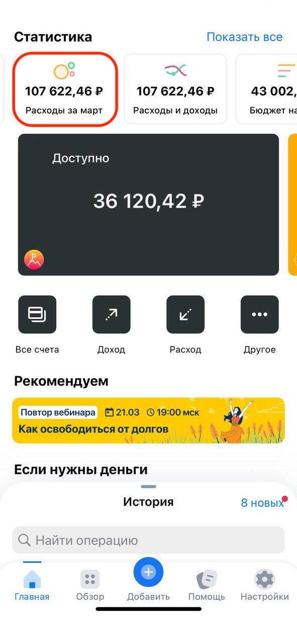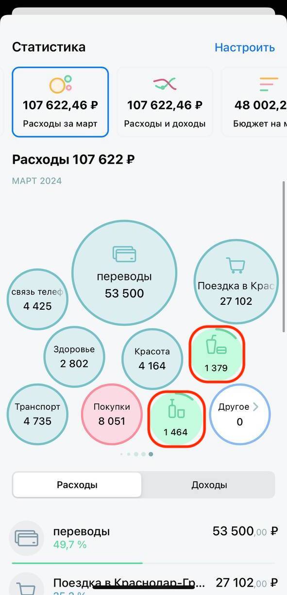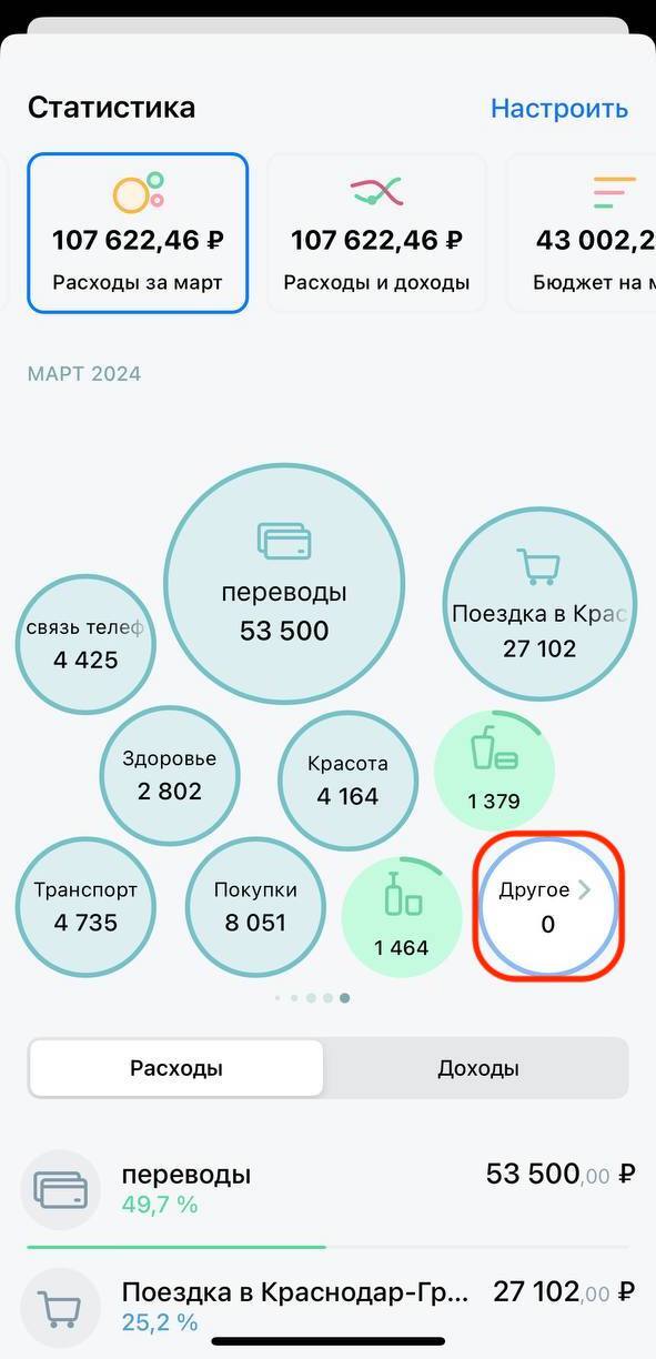 Если на экране пузырьковой статистики не помещаются все категории, расходы по ним можно увидеть, нажав на пузырек с синими краями Другое в правом нижнем углу.