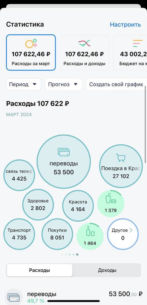 Листайте статистику свайпом по графику слева направо, чтобы увидеть расходы за предыдущие периоды.