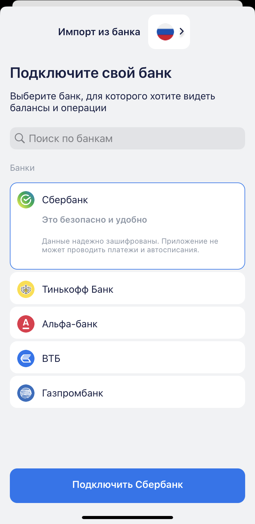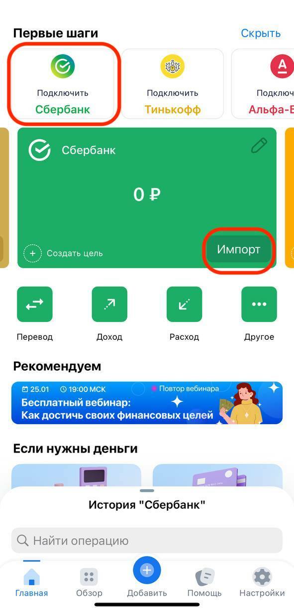 Подключить импорт банковских операций для Сбербанка можно через главный экран приложения (кнопка Действия, либо баннер) либо через карточку счета. При создании импорта через карточку счета необходимо создать новый счет в приложении.