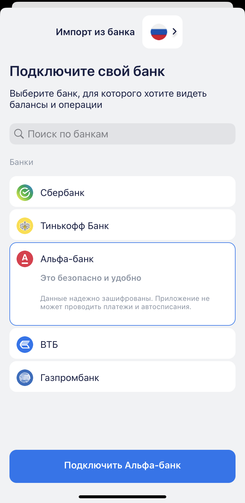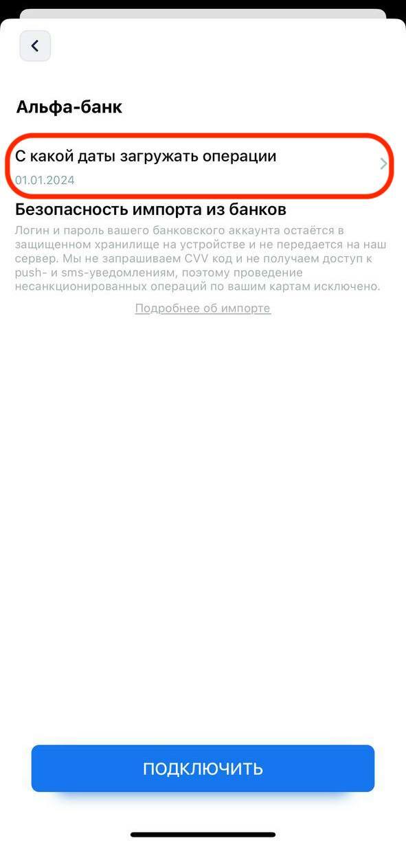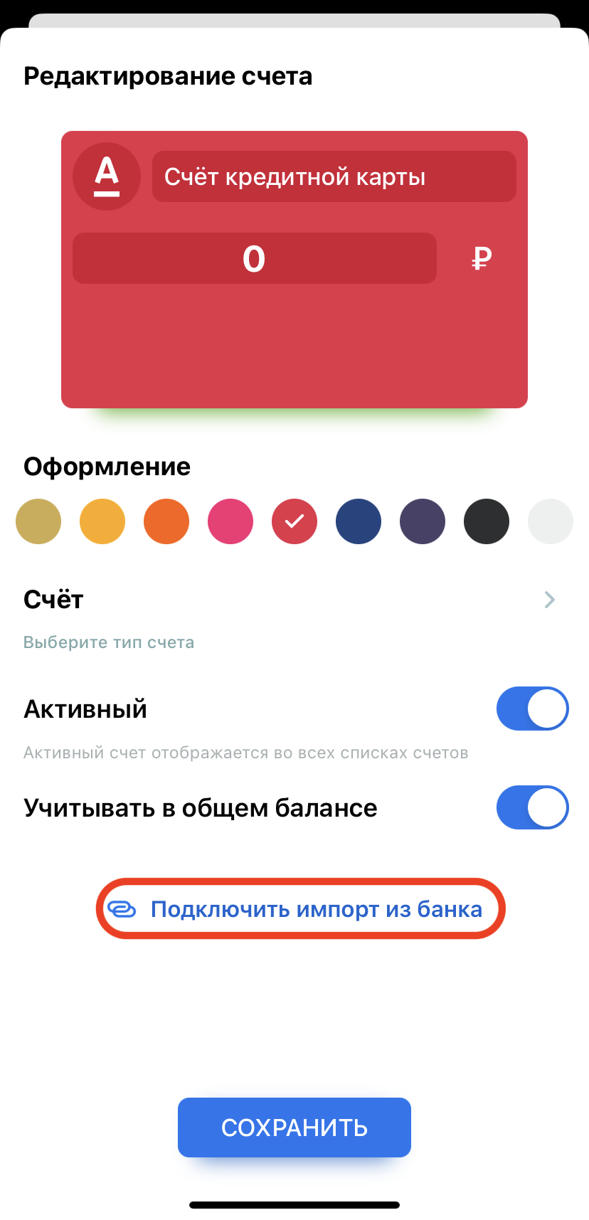 Подключить импорт банковских операций для Альфа банка можно через главный экран приложения (кнопка Действия, либо баннер) либо через карточку счета. При создании импорта через карточку счета необходимо создать новый счет в приложении.
