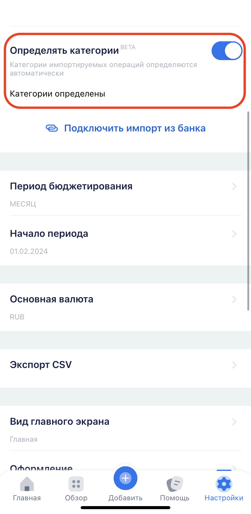 При включении функции автокатегоризации в профиле будет происходить автоматическое определение категорий для импортируемых операций (как через импорт банковских операций, так и через импорт СМС).