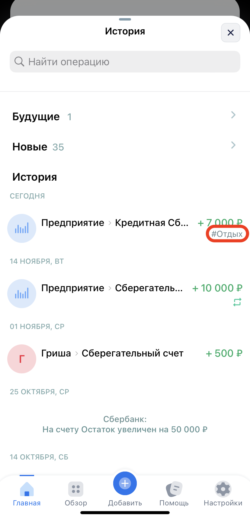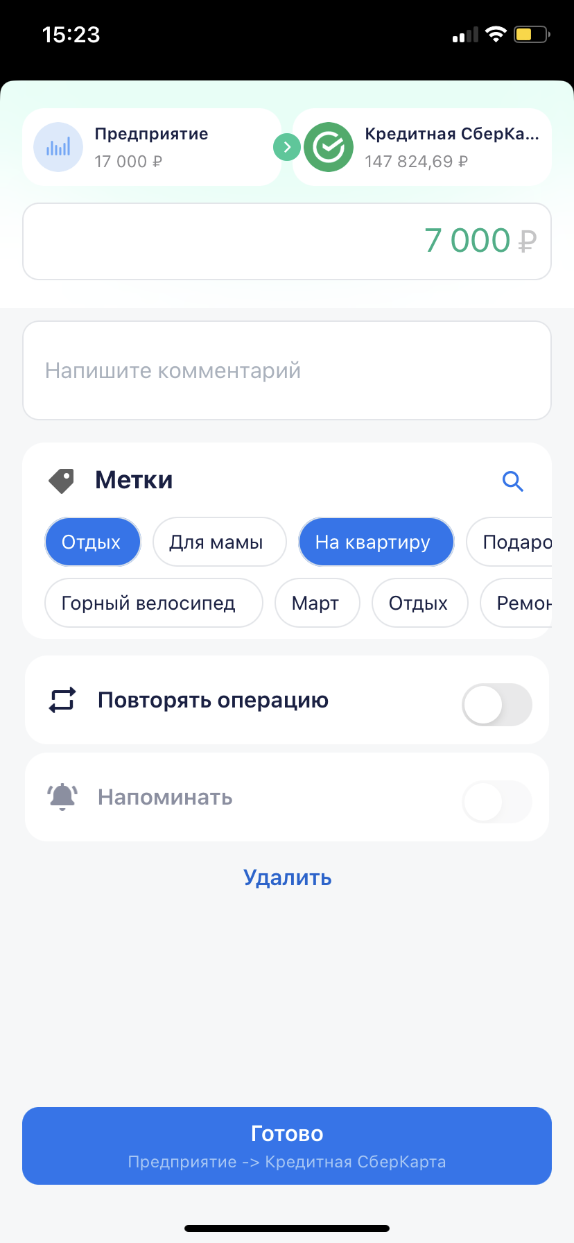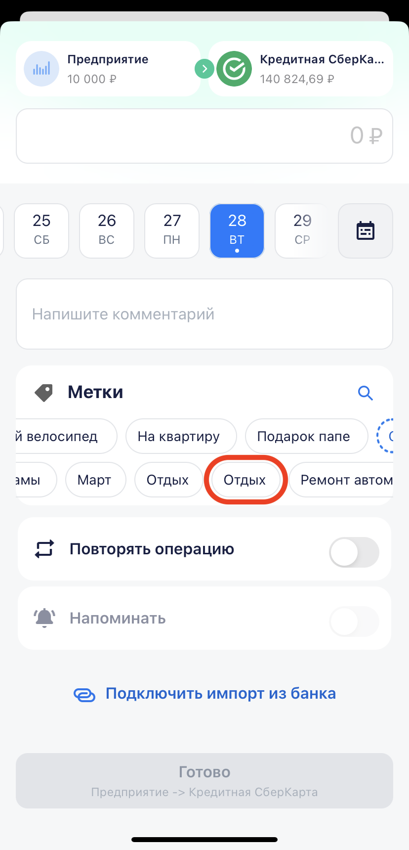 С помощью меток (тегов) в приложении можно детализировать расходы. Добавляя метку к операции, можно увидеть, сколько денег приходится на конкретную статью расходов или доходов.