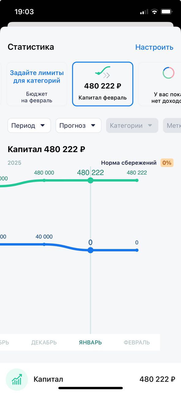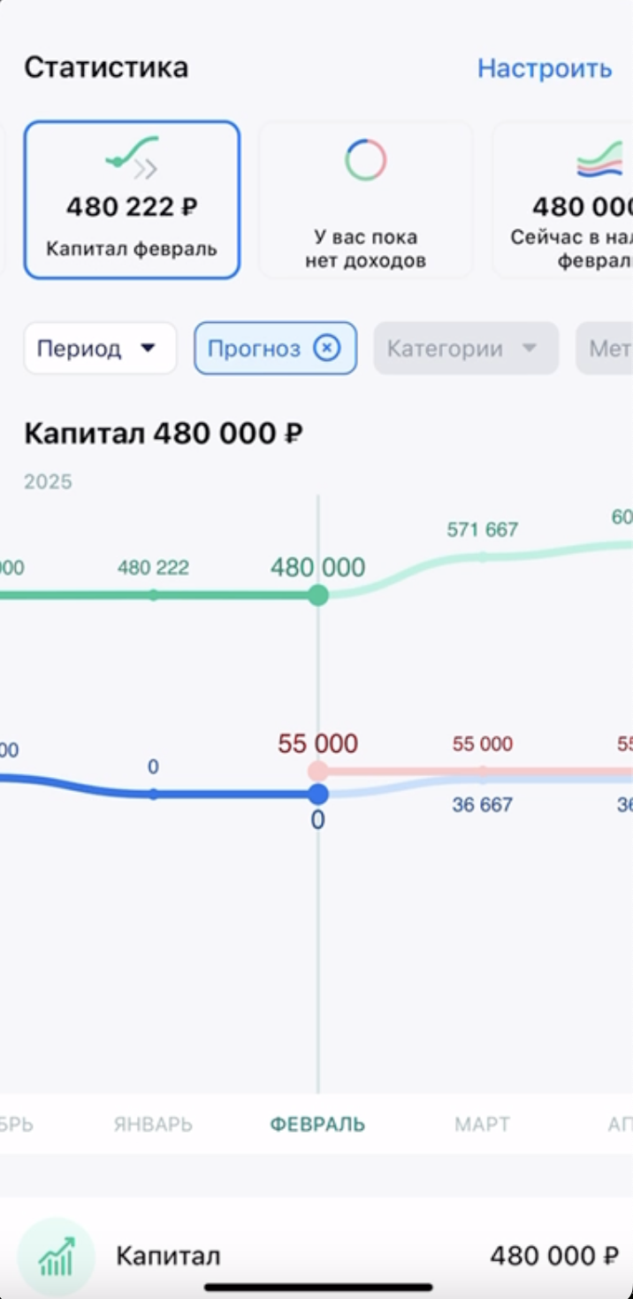 Как строится график капитала?- Зеленая линия (Капитал) — сумма всех счетов на текущий момент, независимо от того, скрыты они или нет. Даже если счет отключен в параметрах учета ("учитывать в общем балансе"), он все равно входит в расчет.