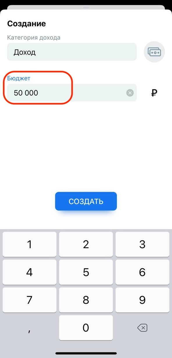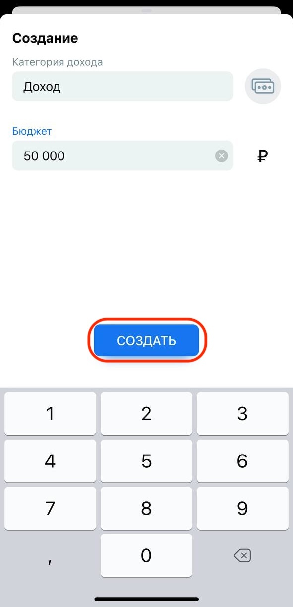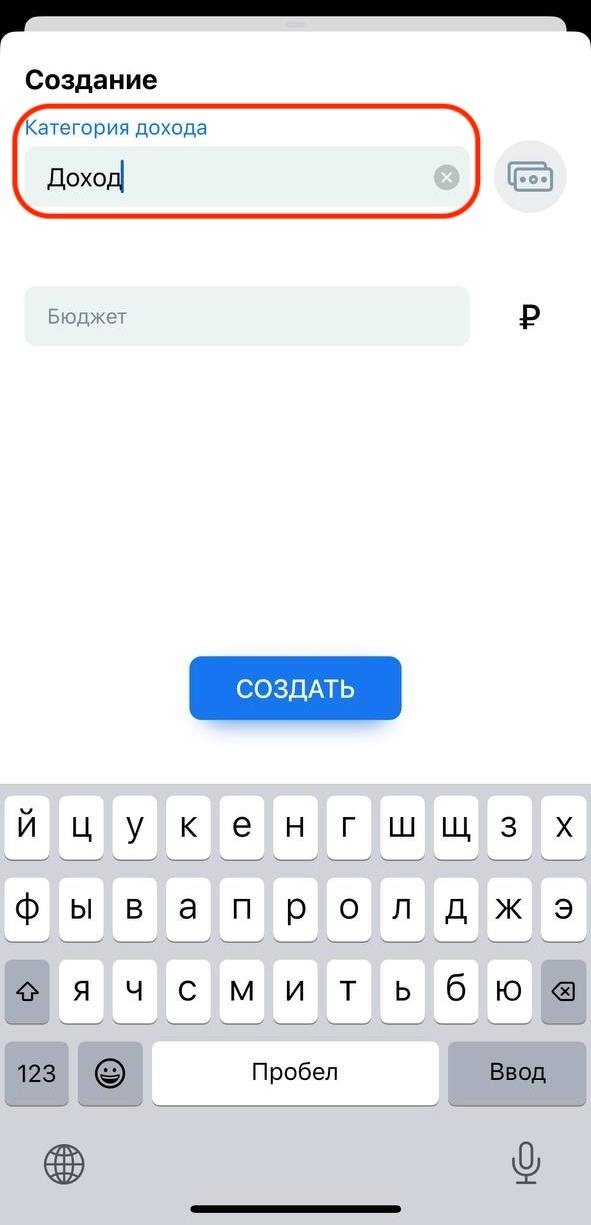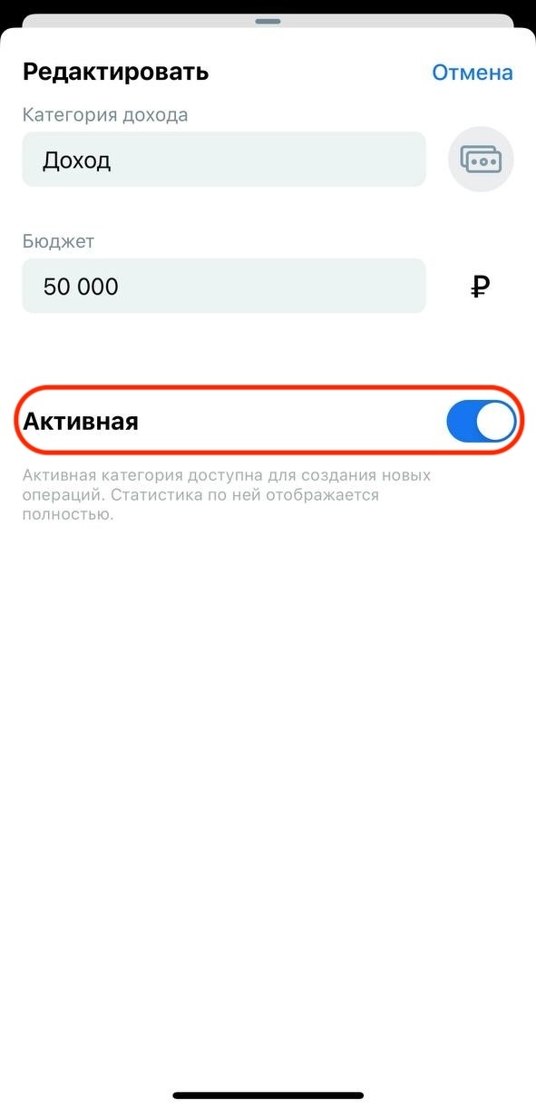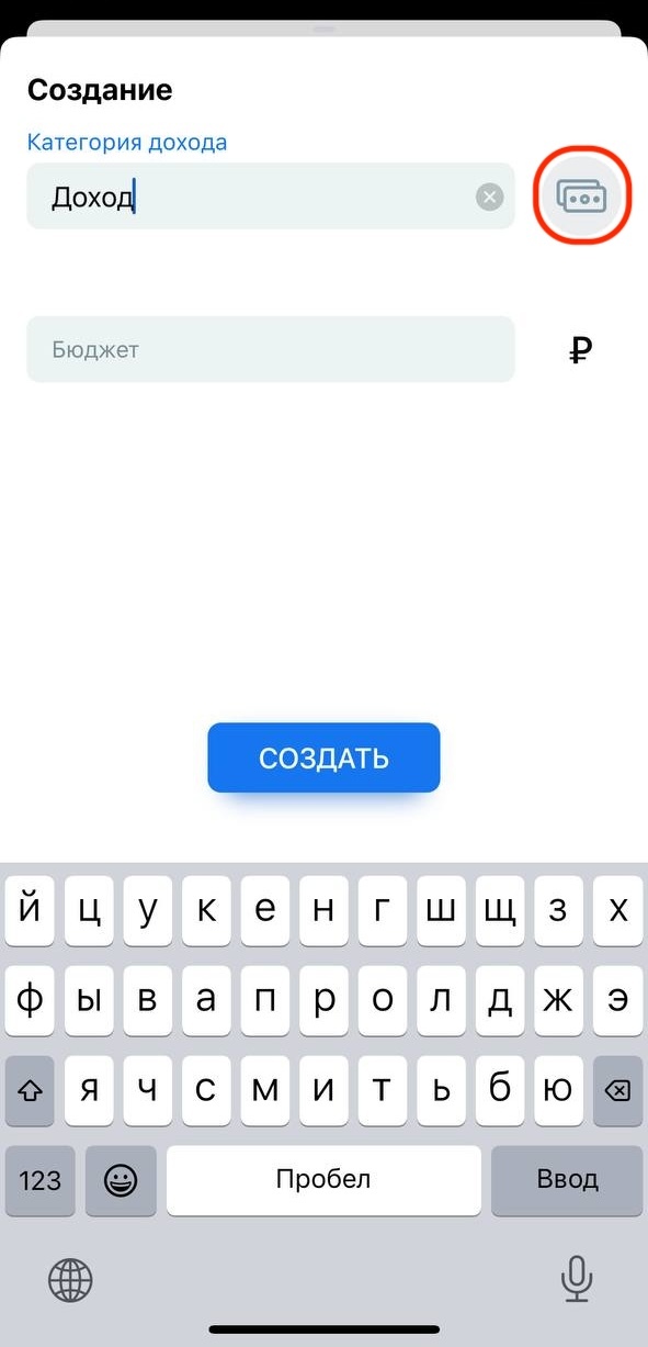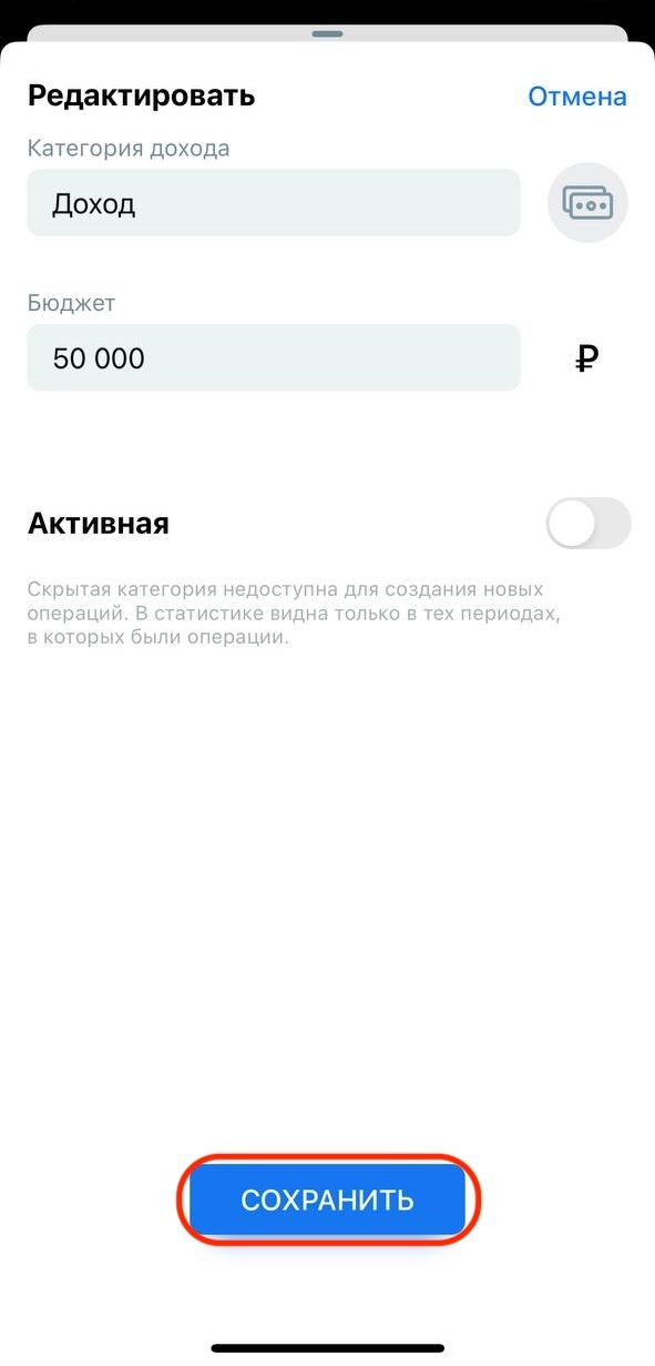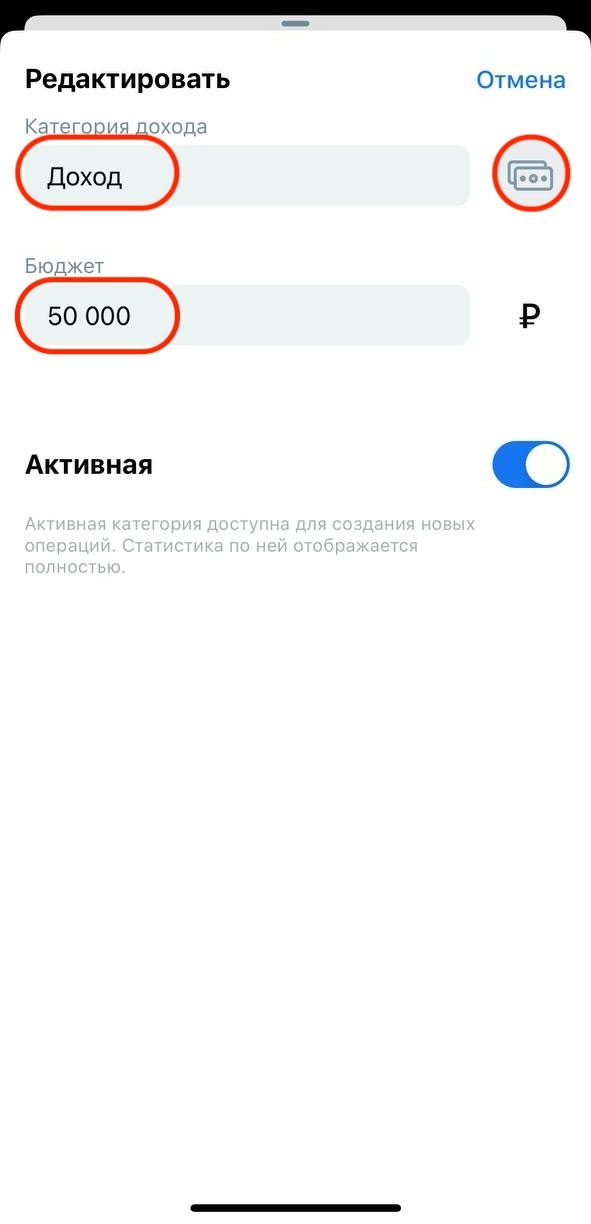 В окне редактирования источника дохода можно изменить название источника, иконку, бюджет. Валюту источника дохода изменить нельзя (она устанавливается автоматически в соответствии с основной валютой приложения).